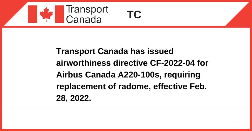 Transport Canada has issued airworthiness directive CF-2022-04 for Airbus Canada A220-100s, requiring replacement of radome, effective Feb. 28, 2022.
