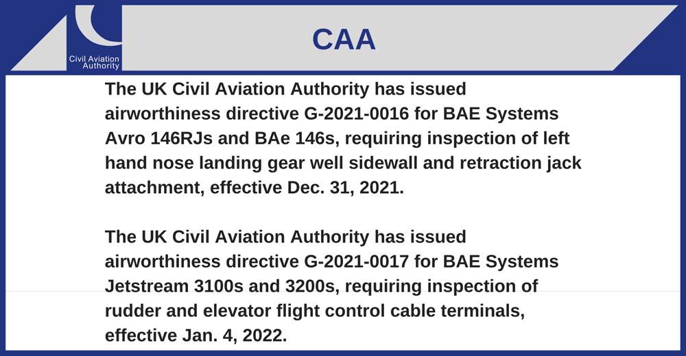 The UK Civil Aviation Authority has issued airworthiness directive G-2021-0016 for BAE Systems Avro 146RJs and BAe 146s, requiring inspection of left hand nose landing gear well sidewall and retraction jack attachment, effective Dec. 31, 2021.
