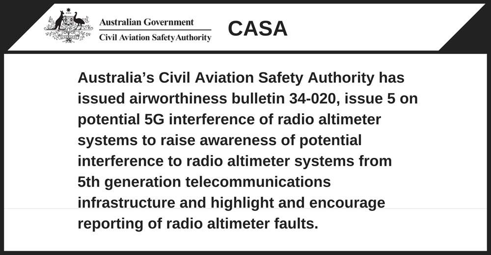 Australia’s Civil Aviation Safety Authority has issued airworthiness bulletin 34-020, issue 5 on potential 5G interference of radio altimeter systems to raise awareness of potential interference to radio altimeter systems from 5th generation telecommunications infrastructure and highlight and encourage reporting of radio altimeter faults.