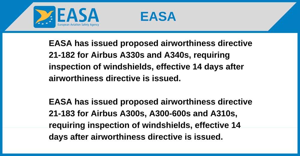 EASA has issued proposed airworthiness directive 21-182 for Airbus A330s and A340s, requiring inspection of windshields, effective 14 days after airworthiness directive is issued.