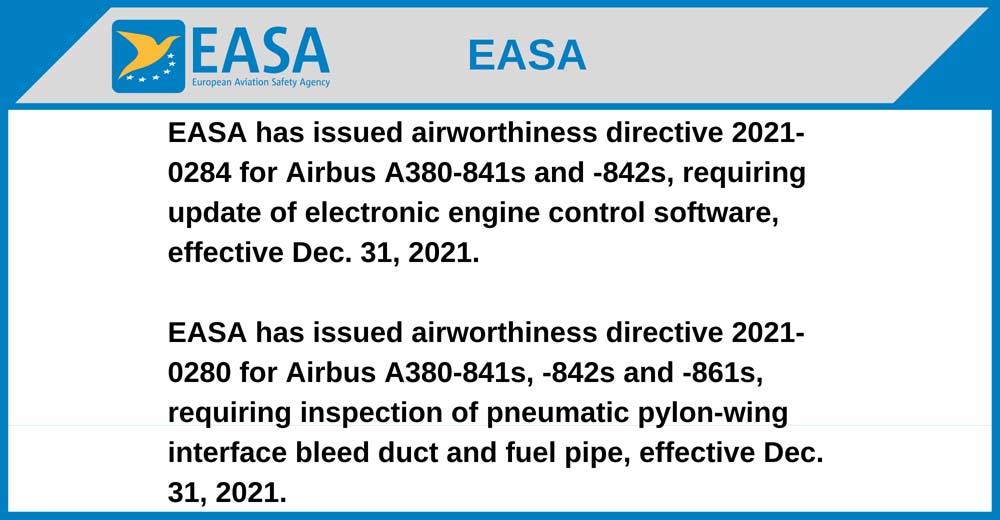 EASA has issued airworthiness directive 2021-0284 for Airbus A380-841s and -842s, requiring update of electronic engine control software, effective Dec. 31, 2021.