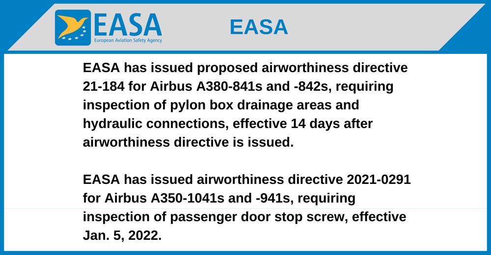 EASA has issued airworthiness directive 2021-0291 for Airbus A350-1041s and -941s, requiring inspection of passenger door stop screw, effective Jan. 5, 2022.