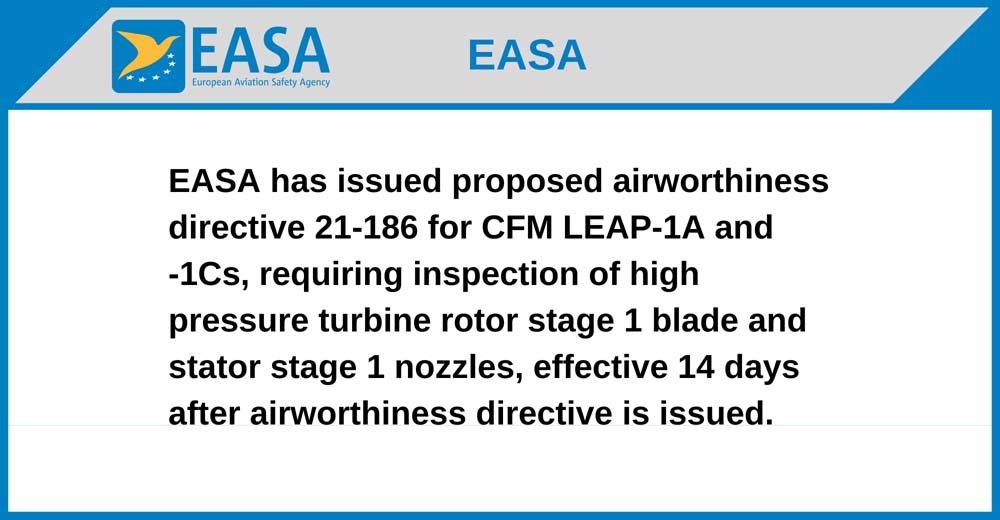 EASA has issued proposed airworthiness directive 21-186 for CFM LEAP-1A and -1Cs, requiring inspection of high pressure turbine rotor stage 1 blade and stator stage 1 nozzles, effective 14 days after airworthiness directive is issued.