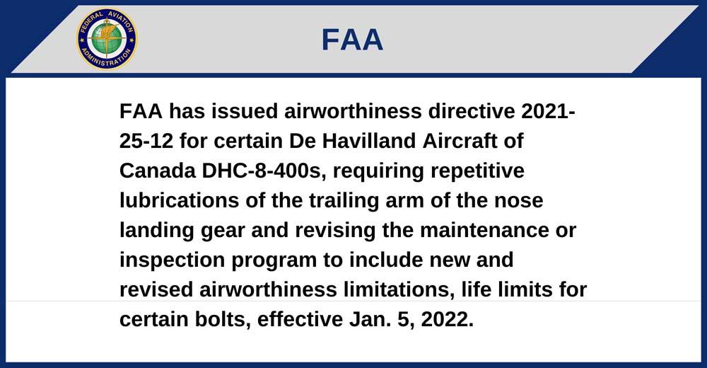 FAA has issued airworthiness directive 2021-25-12 for certain De Havilland Aircraft of Canada DHC-8-400s, requiring repetitive lubrications of the trailing arm of the nose landing gear and revising the maintenance or inspection program to include new and revised airworthiness limitations, life limits for certain bolts, effective Jan. 5, 2022.