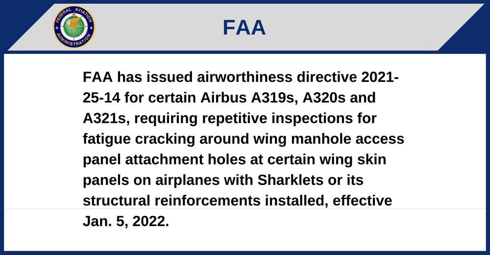 FAA has issued airworthiness directive 2021-25-14 for certain Airbus A319s, A320s and A321s, requiring repetitive inspections for fatigue cracking around wing manhole access panel attachment holes at certain wing skin panels on airplanes with Sharklets or its structural reinforcements installed, effective Jan. 5, 2022.