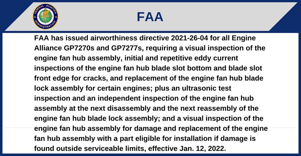 FAA has issued airworthiness directive 2021-26-04 for all Engine Alliance GP7270s and GP7277s, requiring a visual inspection of the engine fan hub assembly, initial and repetitive eddy current inspections of the engine fan hub blade slot bottom and blade slot front edge for cracks, and replacement of the engine fan hub blade lock assembly for certain engines; plus an ultrasonic test inspection and an independent inspection of the engine fan hub assembly at the next disassembly and the next reassembly of the engine fan hub blade lock assembly; and a visual inspection of the engine fan hub assembly for damage and replacement of the engine fan hub assembly with a part eligible for installation if damage is found outside serviceable limits, effective Jan. 12, 2022.
