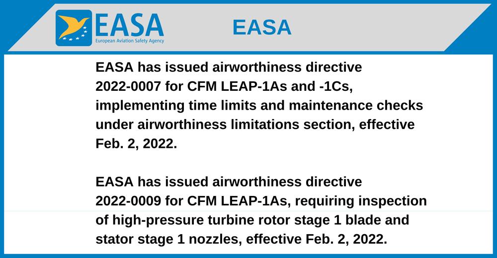 EASA has issued airworthiness directive 2022-0009 for CFM LEAP-1As, requiring inspection of high-pressure turbine rotor stage 1 blade and stator stage 1 nozzles, effective Feb. 2, 2022.