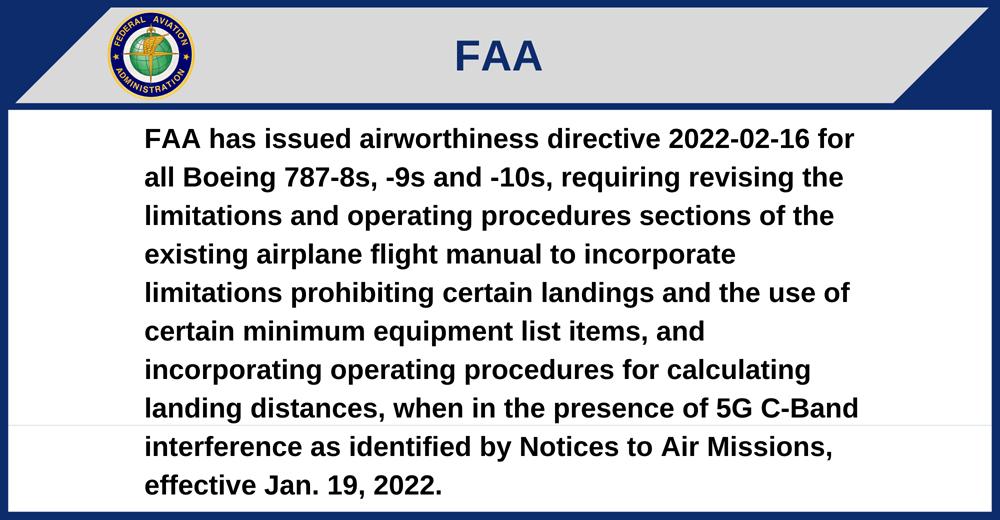 FAA has issued airworthiness directive 2022-02-16 for all Boeing 787-8s, -9s and -10s, requiring revising the limitations and operating procedures sections of the existing airplane flight manual to incorporate limitations prohibiting certain landings and the use of certain minimum equipment list items, and incorporating operating procedures for calculating landing distances, when in the presence of 5G C-Band interference as identified by Notices to Air Missions, effective Jan. 19, 2022.