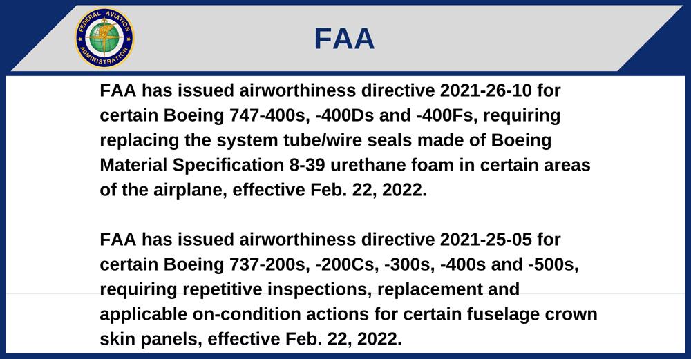 FAA has issued airworthiness directive 2021-26-10 for certain Boeing 747-400s, -400Ds and -400Fs, requiring replacing the system tube/wire seals made of Boeing Material Specification 8-39 urethane foam in certain areas of the airplane, effective Feb. 22, 2022.
