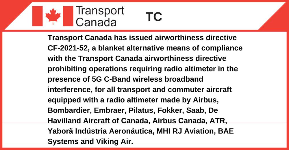 Transport Canada has issued airworthiness directive CF-2021-52, a blanket alternative means of compliance with the Transport Canada airworthiness directive prohibiting operations requiring radio altimeter in the presence of 5G C-Band wireless broadband interference, for all transport and commuter aircraft equipped with a radio altimeter made by Airbus, Bombardier, Embraer, Pilatus, Fokker, Saab, De Havilland Aircraft of Canada, Airbus Canada, ATR, Yaborã Indústria Aeronáutica, MHI RJ Aviation, BAE Systems and Viking Air.