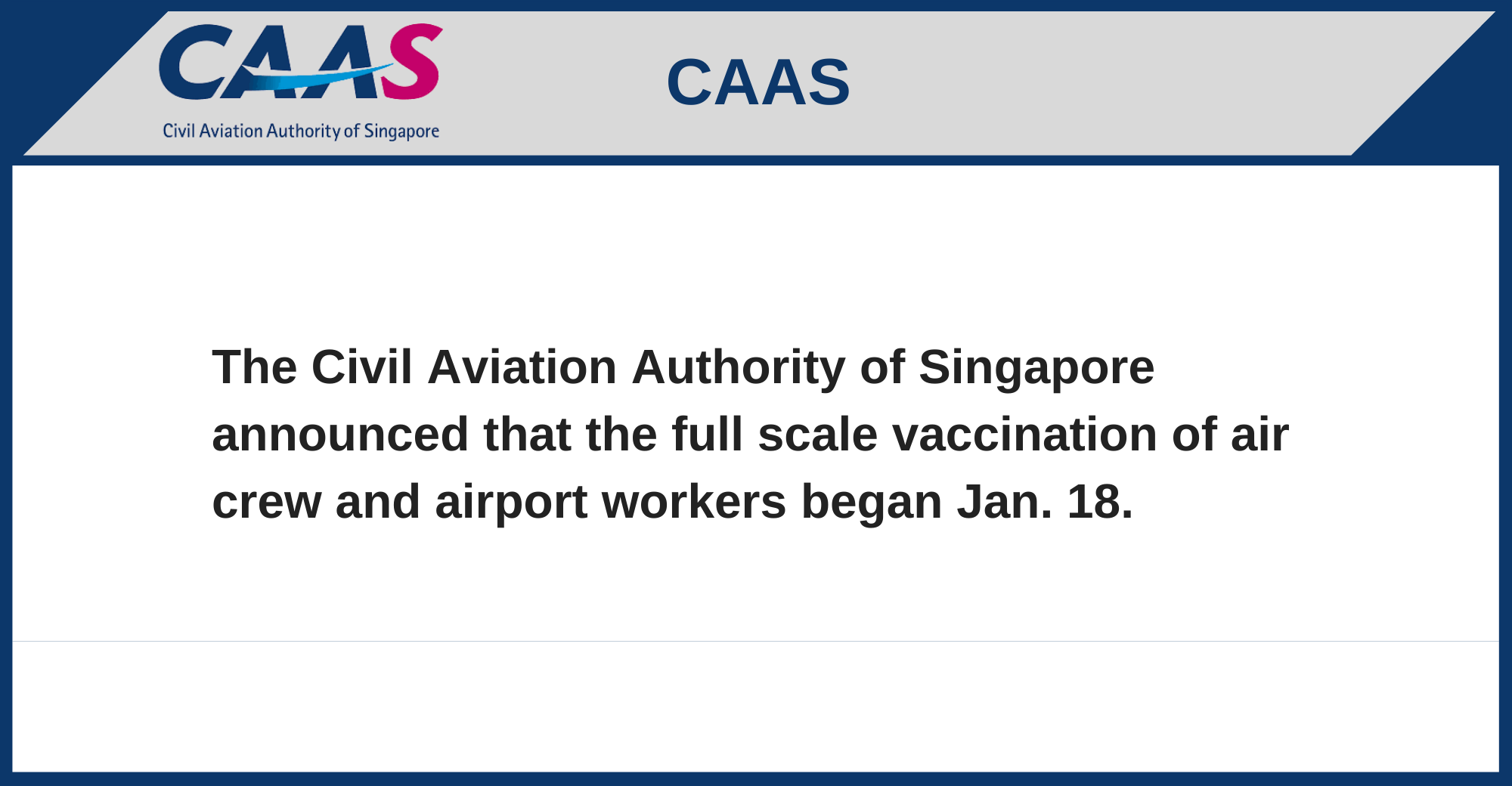 The Civil Aviation Authority of Singapore announced that the full scale vaccination of air crew and airport workers began Jan. 18.