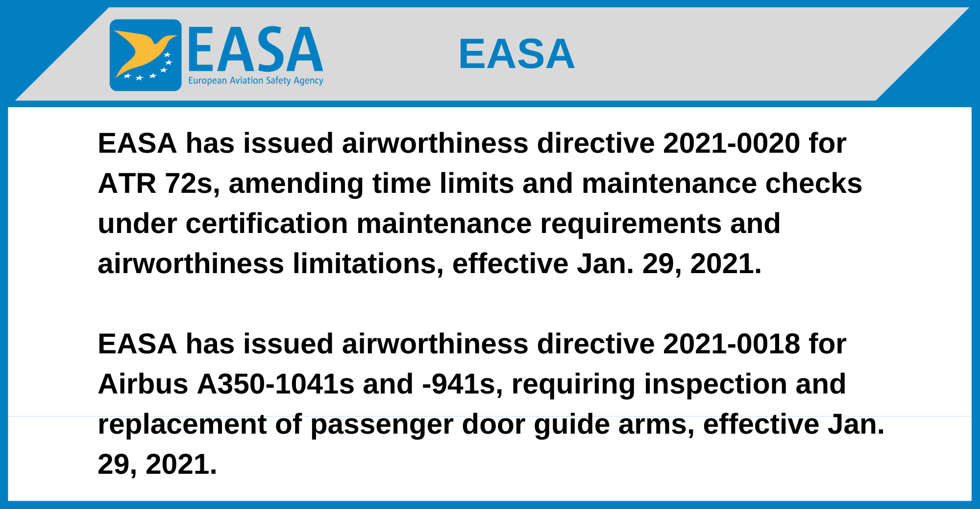 EASA has issued airworthiness directive 2021-0020 for ATR 72s, amending time limits and maintenance checks under certification maintenance requirements and airworthiness limitations, effective Jan. 29, 2021.