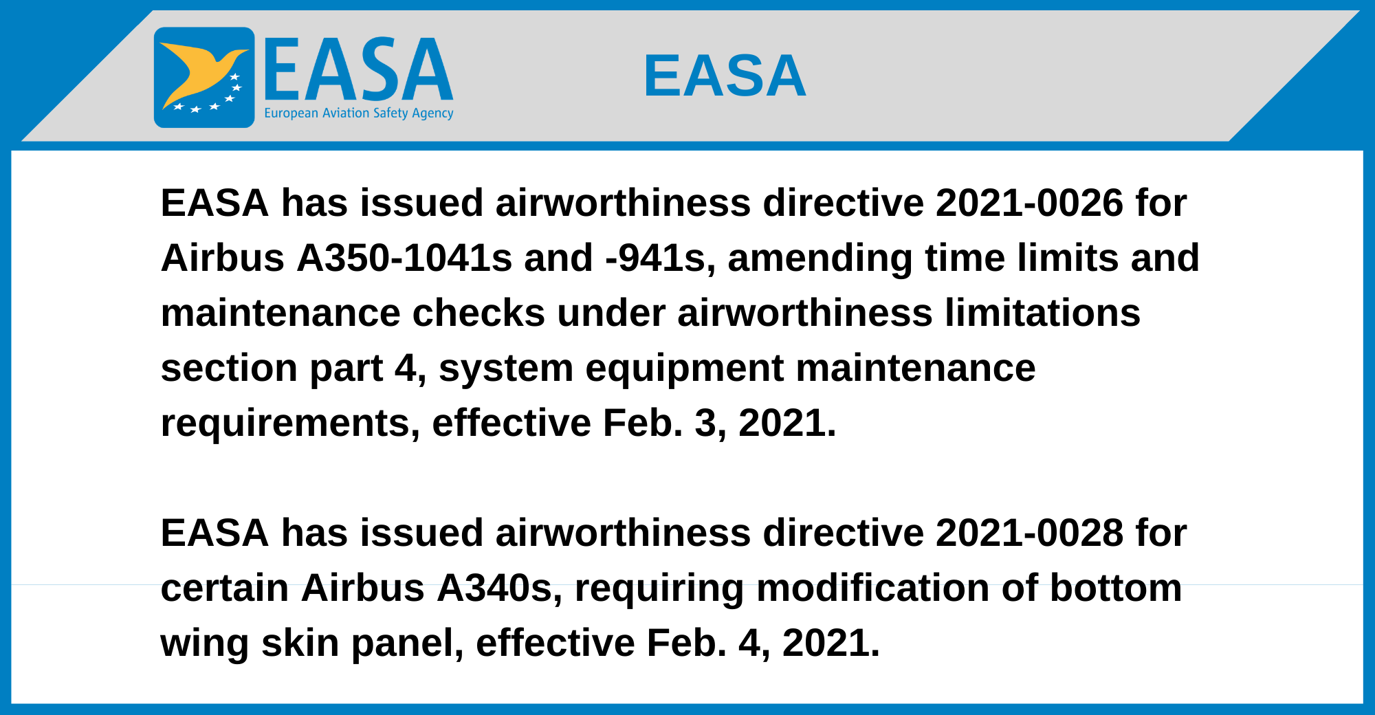 EASA has issued airworthiness directive 2021-0026 for Airbus A350-1041s and -941s, amending time limits and maintenance checks under airworthiness limitations section part 4, system equipment maintenance requirements, effective Feb. 3, 2021.