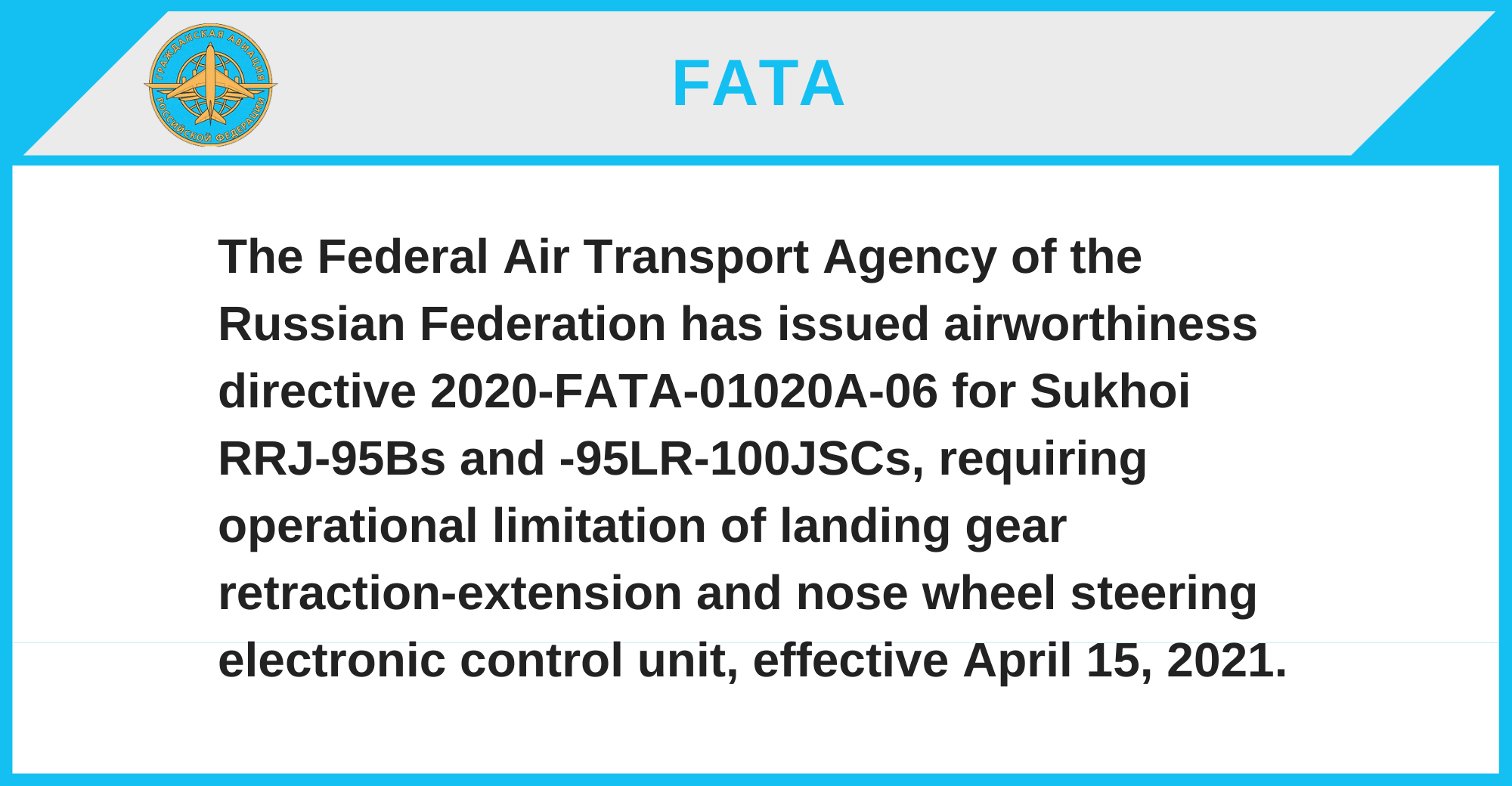The Federal Air Transport Agency of the Russian Federation has issued airworthiness directive 2020-FATA-01020A-06 for Sukhoi RRJ-95Bs and -95LR-100JSCs, requiring operational limitation of landing gear retraction-extension and nose wheel steering electronic control unit, effective April 15, 2021.