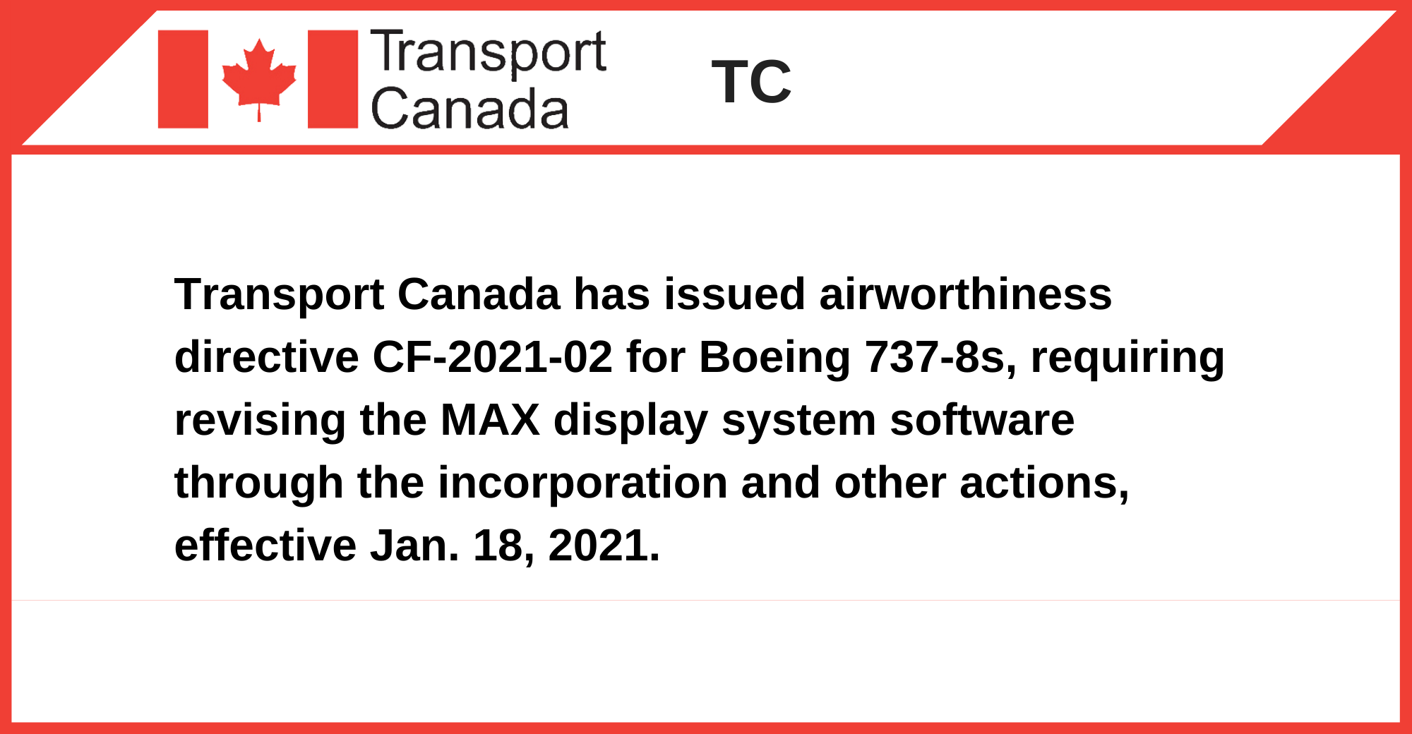 Transport Canada has issued airworthiness directive CF-2021-02 for Boeing 737-8s, requiring revising the MAX display system software through the incorporation and other actions, effective Jan. 18, 2021.