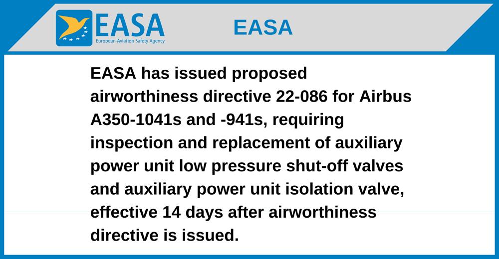 EASA has issued proposed airworthiness directive 22-086 for Airbus A350-1041s and -941s, requiring inspection and replacement of auxiliary power unit low pressure shut-off valves and auxiliary power unit isolation valve, effective 14 days after airworthiness directive is issued.