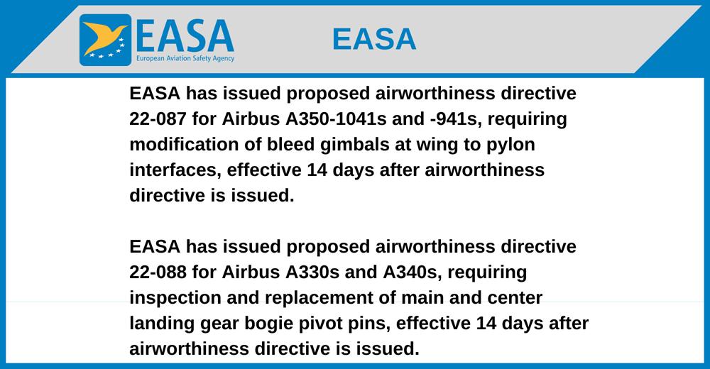 EASA has issued proposed airworthiness directive 22-087 for Airbus A350-1041s and -941s, requiring modification of bleed gimbals at wing to pylon interfaces, effective 14 days after airworthiness directive is issued.