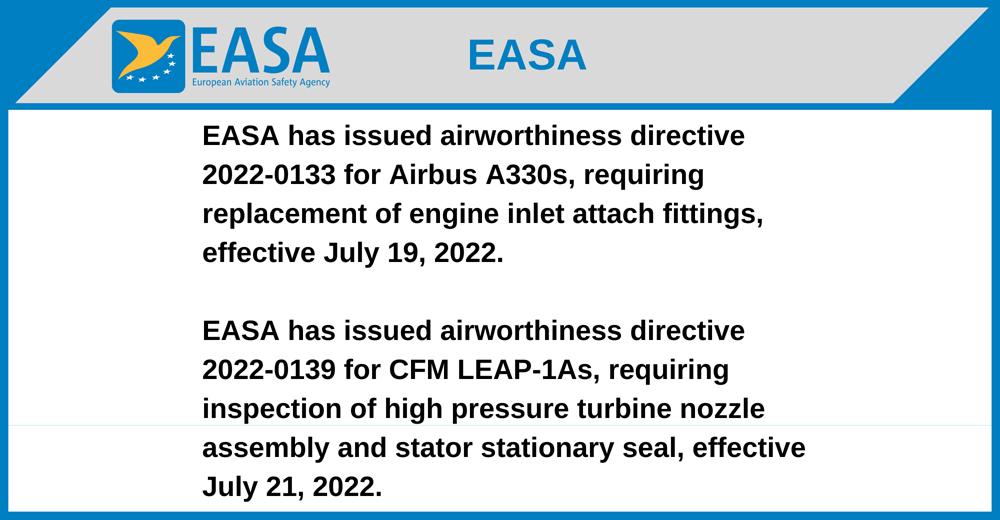 EASA has issued airworthiness directive 2022-0133 for Airbus A330s, requiring replacement of engine inlet attach fittings, effective July 19, 2022.