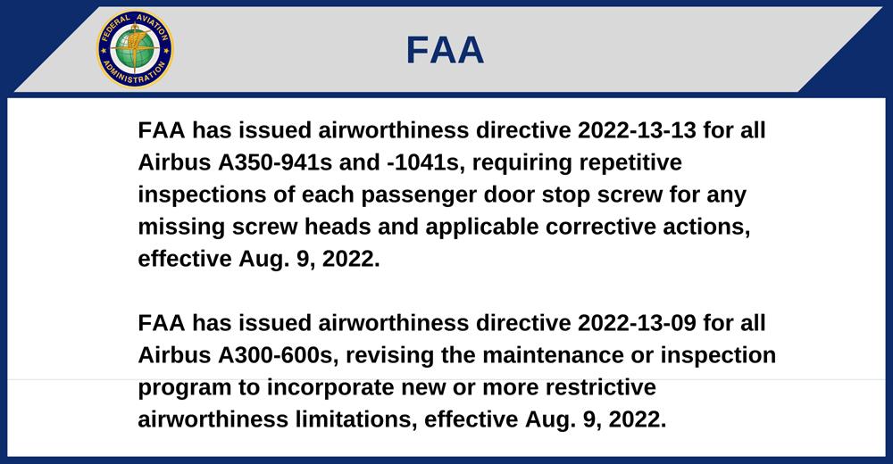 FAA has issued airworthiness directive 2022-13-13 for all Airbus A350-941s and -1041s, requiring repetitive inspections of each passenger door stop screw for any missing screw heads and applicable corrective actions, effective Aug. 9, 2022.