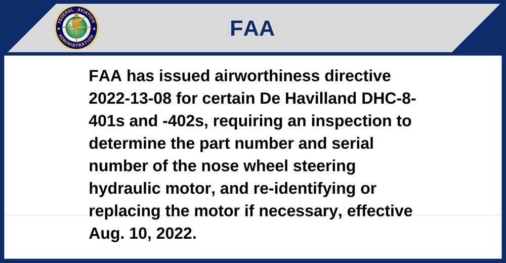 FAA has issued airworthiness directive 2022-13-08 for certain De Havilland DHC-8-401s and -402s, requiring an inspection to determine the part number and serial number of the nose wheel steering hydraulic motor, and re-identifying or replacing the motor if necessary, effective Aug. 10, 2022.