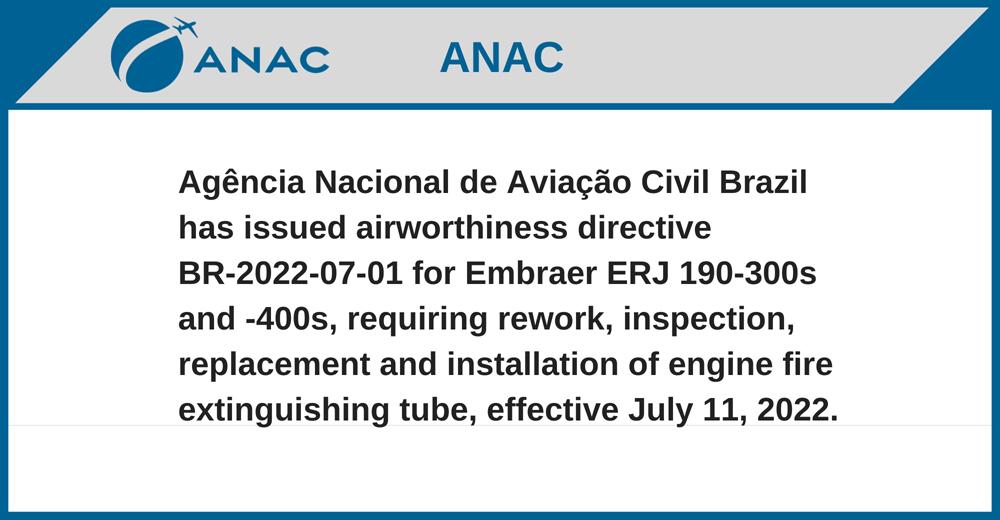 Agência Nacional de Aviação Civil Brazil has issued airworthiness directive BR-2022-07-01 for Embraer ERJ 190-300s and -400s, requiring rework, inspection, replacement and installation of engine fire extinguishing tube, effective July 11, 2022.