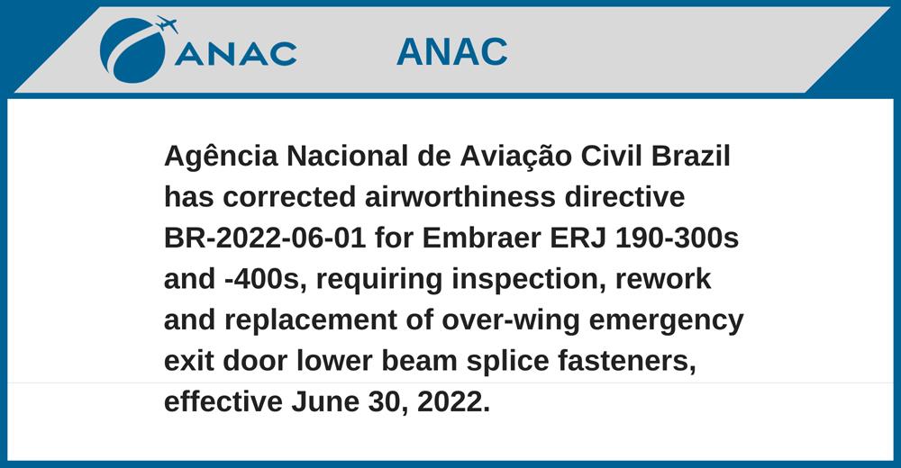 Agência Nacional de Aviação Civil Brazil has corrected airworthiness directive BR-2022-06-01 for Embraer ERJ 190-300s and -400s, requiring inspection, rework and replacement of over-wing emergency exit door lower beam splice fasteners, effective June 30, 2022.