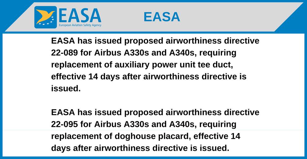 EASA has issued proposed airworthiness directive 22-089 for Airbus A330s and A340s, requiring replacement of auxiliary power unit tee duct, effective 14 days after airworthiness directive is issued.