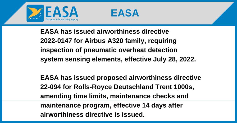 EASA has issued airworthiness directive 2022-0147 for Airbus A320 family, requiring inspection of pneumatic overheat detection system sensing elements, effective July 28, 2022.