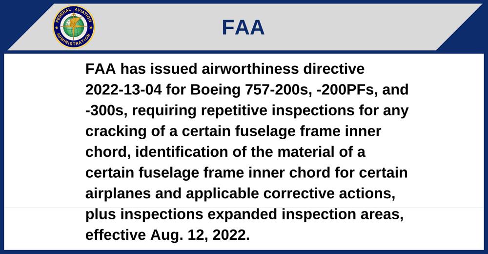 FAA has issued airworthiness directive 2022-13-04 for Boeing 757-200s, -200PFs, and -300s, requiring repetitive inspections for any cracking of a certain fuselage frame inner chord, identification of the material of a certain fuselage frame inner chord for certain airplanes and applicable corrective actions, plus inspections expanded inspection areas, effective Aug. 12, 2022.