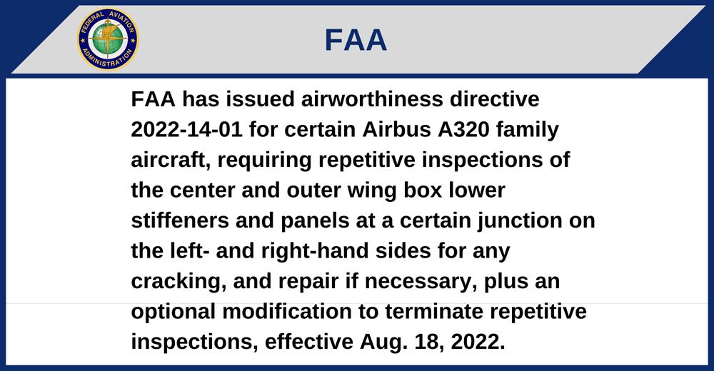 FAA has issued airworthiness directive 2022-14-01 for certain Airbus A320 family aircraft, requiring repetitive inspections of the center and outer wing box lower stiffeners and panels at a certain junction on the left- and right-hand sides for any cracking, and repair if necessary, plus an optional modification to terminate repetitive inspections, effective Aug. 18, 2022.