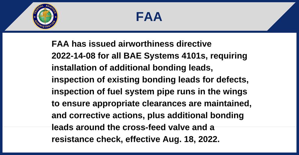 FAA has issued airworthiness directive 2022-14-08 for all BAE Systems 4101s, requiring installation of additional bonding leads, inspection of existing bonding leads for defects, inspection of fuel system pipe runs in the wings to ensure appropriate clearances are maintained, and corrective actions, plus additional bonding leads around the cross-feed valve and a resistance check, effective Aug. 18, 2022.
