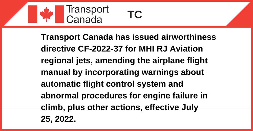Transport Canada has issued airworthiness directive CF-2022-37 for MHI RJ Aviation regional jets, amending the airplane flight manual by incorporating warnings about automatic flight control system and abnormal procedures for engine failure in climb, plus other actions, effective July 25, 2022.