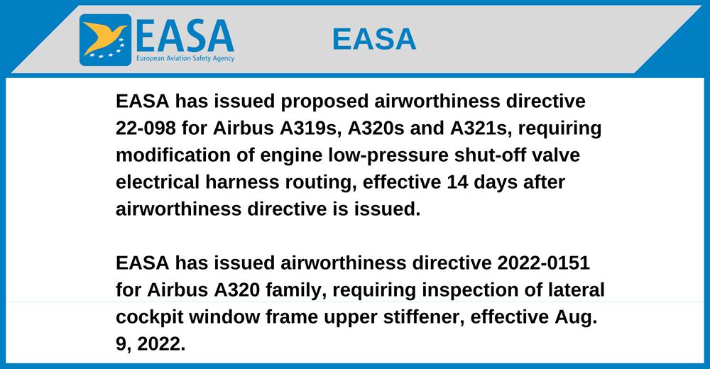 EASA has issued airworthiness directive 2022-0151 for Airbus A320 family, requiring inspection of lateral cockpit window frame upper stiffener, effective Aug. 9, 2022.