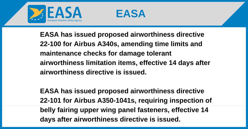 EASA has issued proposed airworthiness directive 22-101 for Airbus A350-1041s, requiring inspection of belly fairing upper wing panel fasteners, effective 14 days after airworthiness directive is issued.
