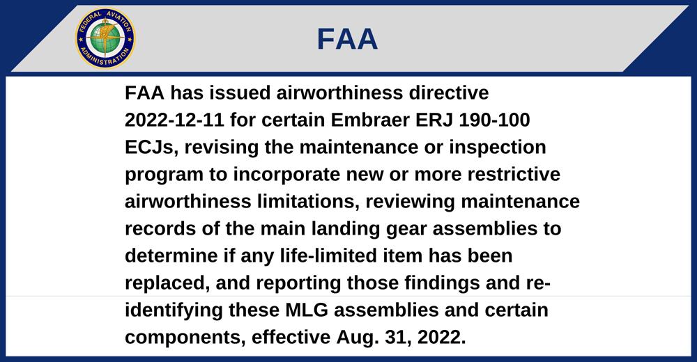 FAA has issued airworthiness directive 2022-12-11 for certain Embraer ERJ 190-100 ECJs, revising the maintenance or inspection program to incorporate new or more restrictive airworthiness limitations, reviewing maintenance records of the main landing gear assemblies to determine if any life-limited item has been replaced, and reporting those findings and re-identifying these MLG assemblies and certain components, effective Aug. 31, 2022.