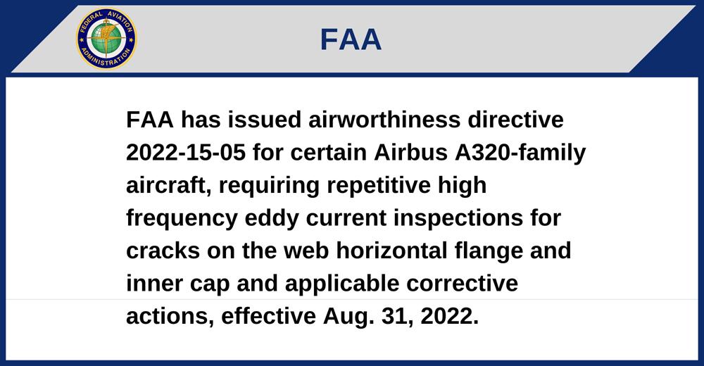 FAA has issued airworthiness directive 2022-15-05 for certain Airbus A320-family aircraft, requiring repetitive high frequency eddy current inspections for cracks on the web horizontal flange and inner cap and applicable corrective actions, effective Aug. 31, 2022.