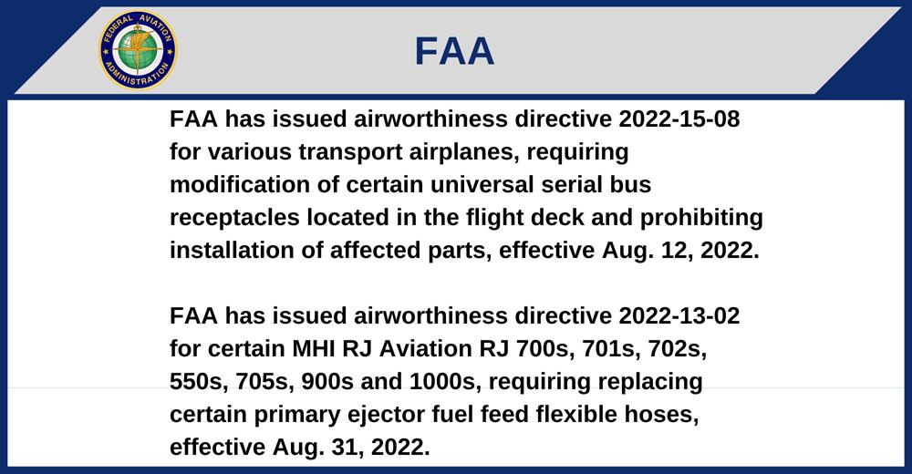 FAA has issued airworthiness directive 2022-15-08 for various transport airplanes, requiring modification of certain universal serial bus receptacles located in the flight deck and prohibiting installation of affected parts, effective Aug. 12, 2022.