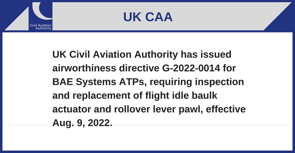 UK Civil Aviation Authority has issued airworthiness directive G-2022-0014 for BAE Systems ATPs, requiring inspection and replacement of flight idle baulk actuator and rollover lever pawl, effective Aug. 9, 2022.