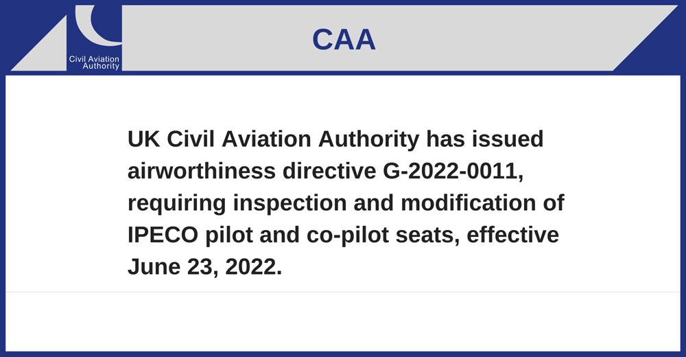 UK Civil Aviation Authority has issued airworthiness directive G-2022-0011, requiring inspection and modification of IPECO pilot and co-pilot seats, effective June 23, 2022.