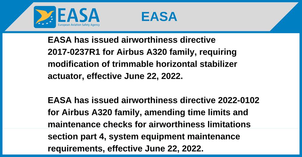 EASA has issued airworthiness directive 2017-0237R1 for Airbus A320 family, requiring modification of trimmable horizontal stabilizer actuator, effective June 22, 2022.