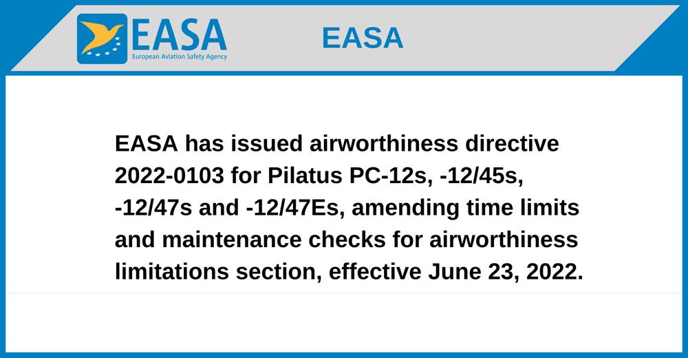 EASA has issued airworthiness directive 2022-0103 for Pilatus PC-12s, -12/45s, -12/47s and -12/47Es, amending time limits and maintenance checks for airworthiness limitations section, effective June 23, 2022.