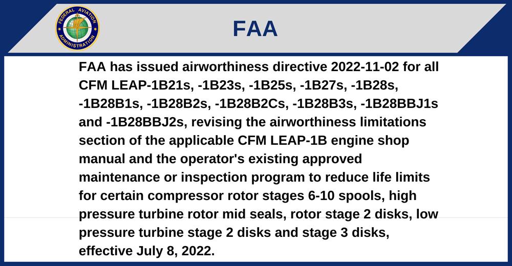 FAA has issued airworthiness directive 2022-11-02 for all CFM LEAP-1B21s, -1B23s, -1B25s, -1B27s, -1B28s, -1B28B1s, -1B28B2s, -1B28B2Cs, -1B28B3s, -1B28BBJ1s and -1B28BBJ2s, revising the airworthiness limitations section of the applicable CFM LEAP-1B engine shop manual and the operator's existing approved maintenance or inspection program to reduce life limits for certain compressor rotor stages 6-10 spools, high pressure turbine rotor mid seals, rotor stage 2 disks, low pressure turbine stage 2 disks and stage 3 disks, effective July 8, 2022.