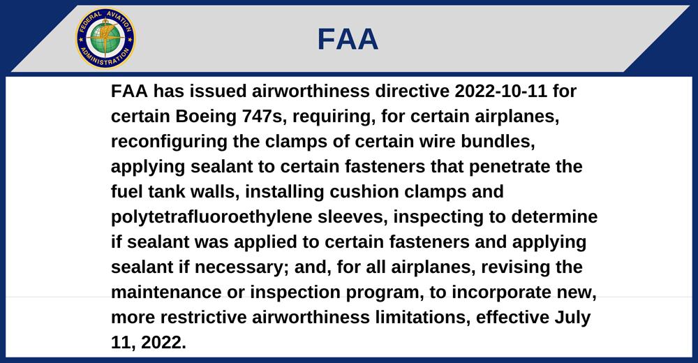 FAA has issued airworthiness directive 2022-10-11 for certain Boeing 747s, requiring, for certain airplanes, reconfiguring the clamps of certain wire bundles, applying sealant to certain fasteners that penetrate the fuel tank walls, installing cushion clamps and polytetrafluoroethylene sleeves, inspecting to determine if sealant was applied to certain fasteners and applying sealant if necessary; and, for all airplanes, revising the maintenance or inspection program, to incorporate new, more restrictive airworthiness limitations, effective July 11, 2022.