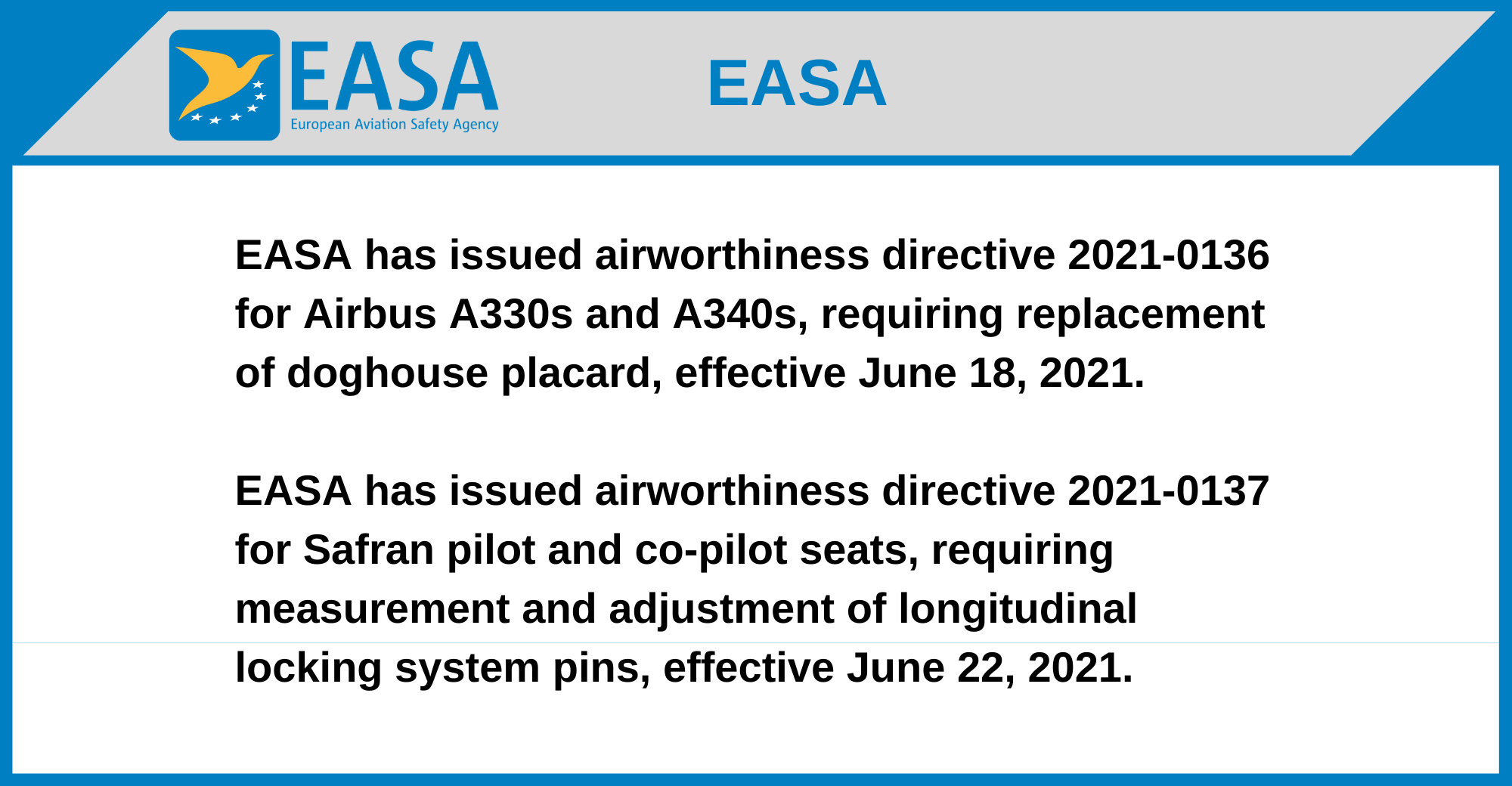EASA has issued airworthiness directive 2021-0136 for Airbus A330s and A340s, requiring replacement of doghouse placard, effective June 18, 2021.