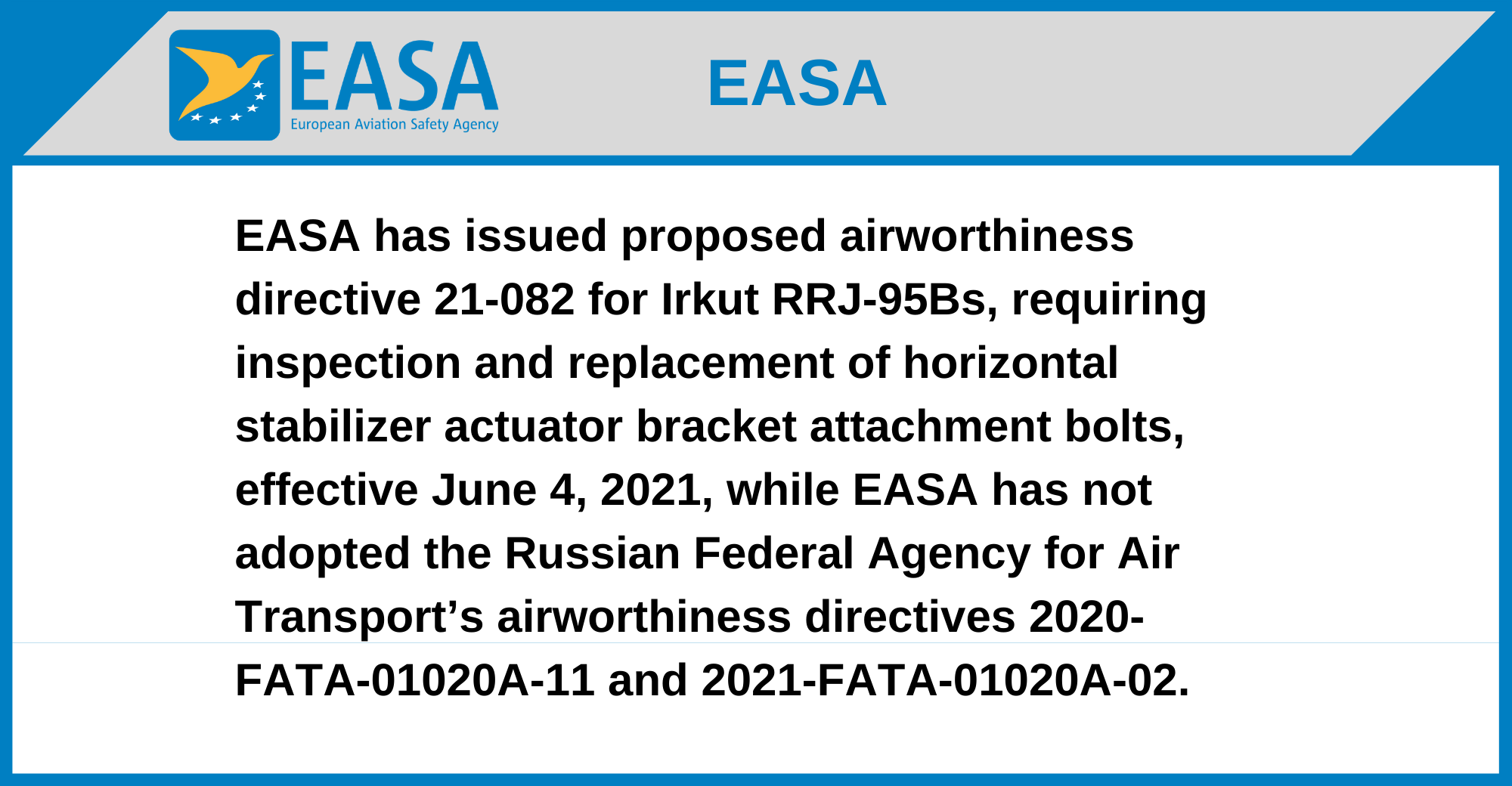 EASA has issued proposed airworthiness directive 21-082 for Irkut RRJ-95Bs, requiring inspection and replacement of horizontal stabilizer actuator bracket attachment bolts, effective June 4, 2021, while EASA has not adopted the Russian Federal Agency for Air Transport’s airworthiness directives 2020-FATA-01020A-11 and 2021-FATA-01020A-02.