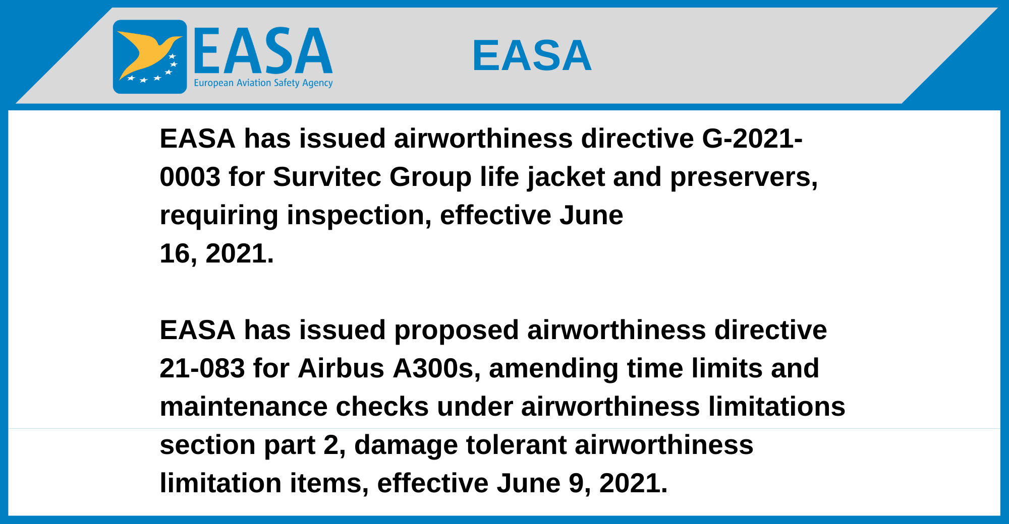 EASA has issued airworthiness directive G-2021-0003 for Survitec Group life jacket and preservers, requiring inspection, effective June 16, 2021.