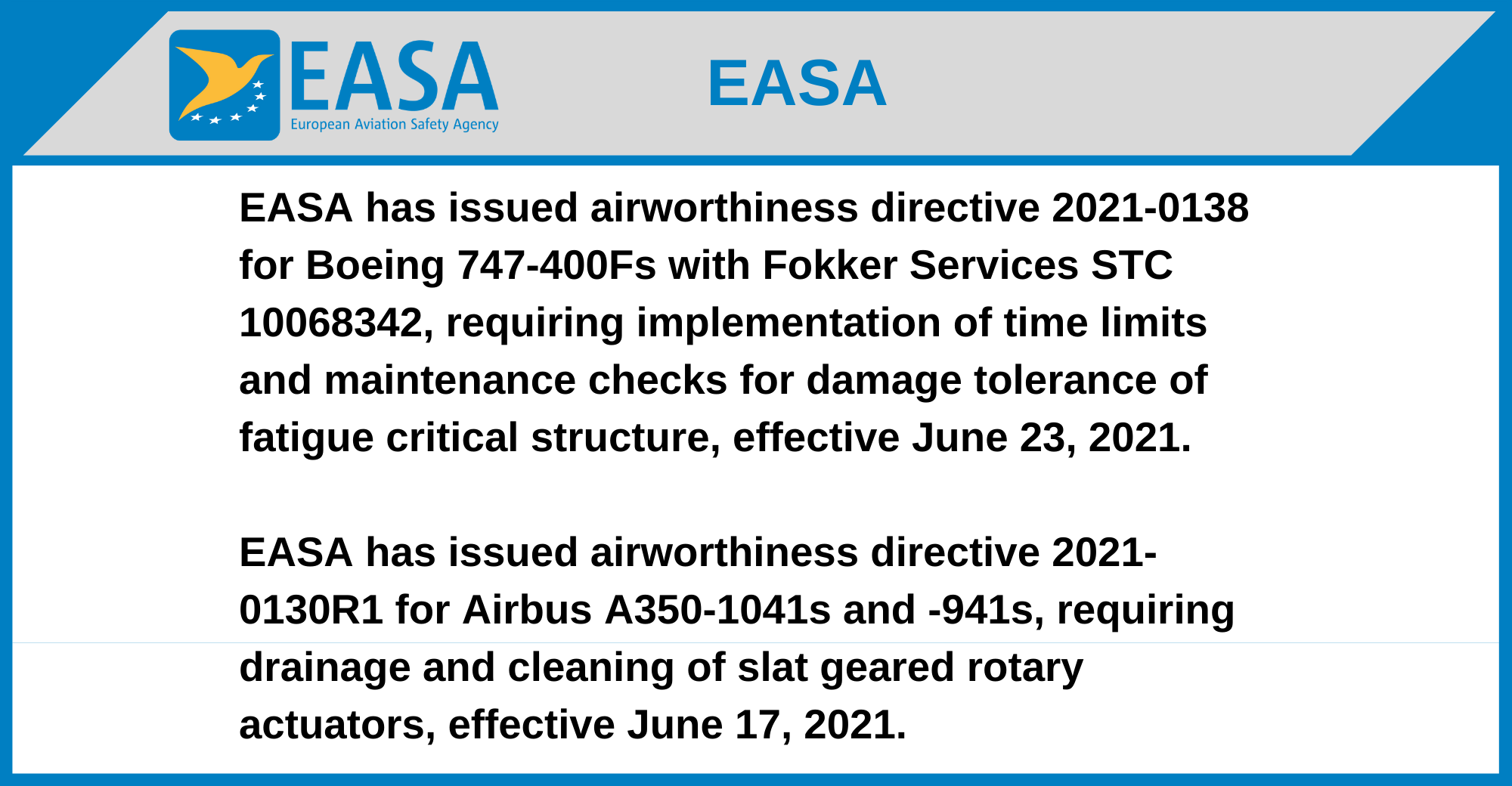 EASA has issued airworthiness directive 2021-0130R1 for Airbus A350-1041s and -941s, requiring drainage and cleaning of slat geared rotary actuators, effective June 17, 2021.