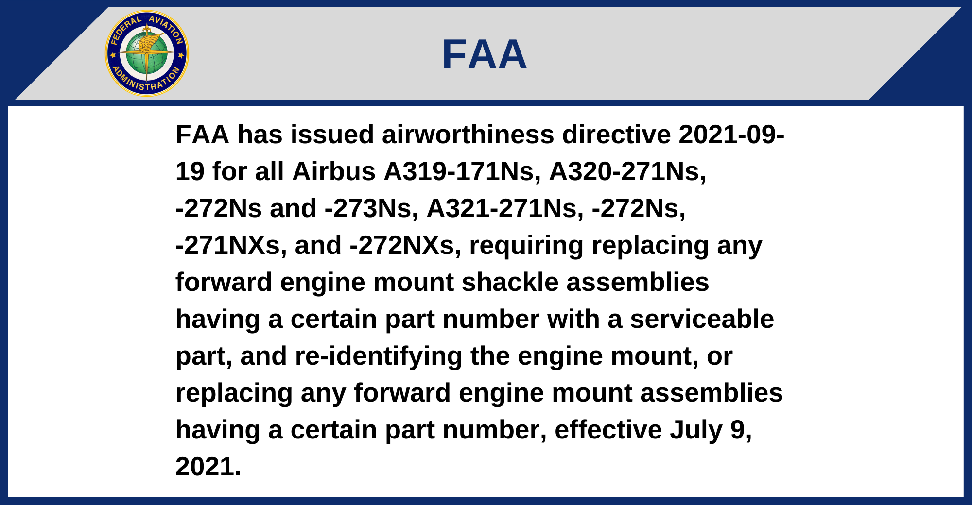 FAA has issued airworthiness directive 2021-09-19 for all Airbus A319-171Ns, A320-271Ns, -272Ns and -273Ns, A321-271Ns, -272Ns, -271NXs, and -272NXs, requiring replacing any forward engine mount shackle assemblies having a certain part number with a serviceable part, and re-identifying the engine mount, or replacing any forward engine mount assemblies having a certain part number, effective July 9, 2021.