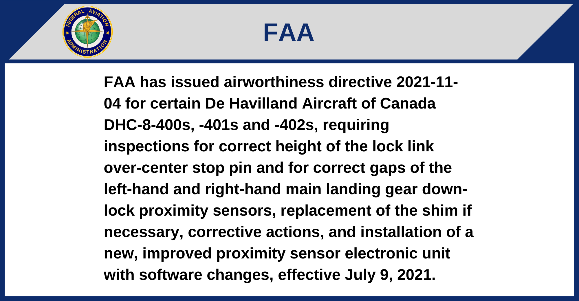 FAA has issued airworthiness directive 2021-11-04 for certain De Havilland Aircraft of Canada DHC-8-400s, -401s and -402s, requiring inspections for correct height of the lock link over-center stop pin and for correct gaps of the left-hand and right-hand main landing gear down-lock proximity sensors, replacement of the shim if necessary, corrective actions, and installation of a new, improved proximity sensor electronic unit with software changes, effective July 9, 2021.