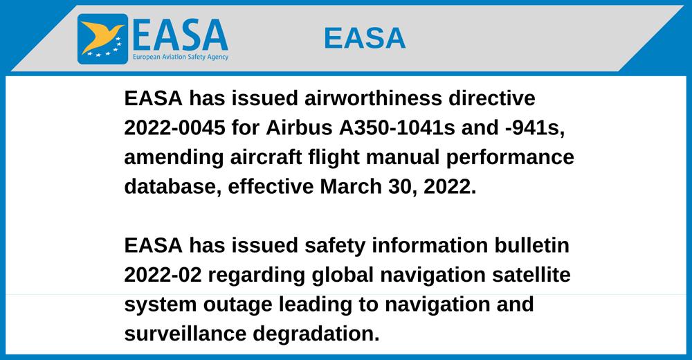 EASA has issued airworthiness directive 2022-0045 for Airbus A350-1041s and -941s, amending aircraft flight manual performance database, effective March 30, 2022.